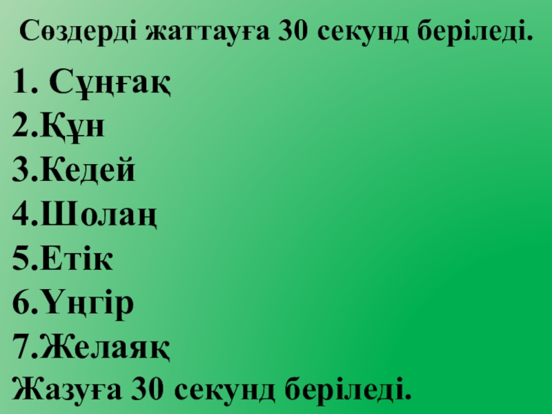 Слайд 11Сөздерді жаттауға 30 секунд беріледі.