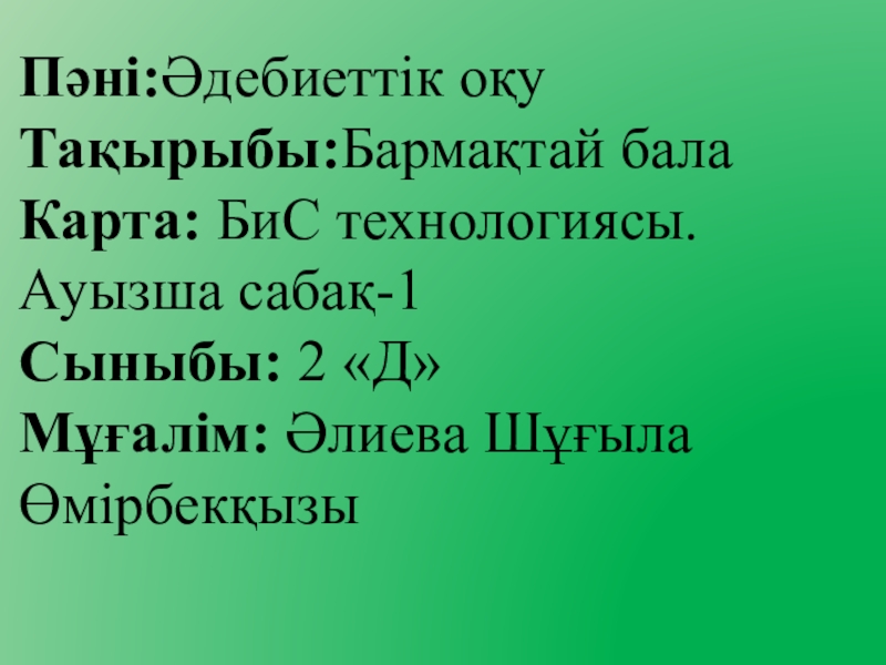 Слайд 1Пәні:Әдебиеттік оқу Тақырыбы:Бармақтай бала Карта: БиС технологиясы. Ауызша сабақ-1 Сыныбы: 2 «Д» Мұғалім: Әлиева Шұғыла Өмірбекқызы