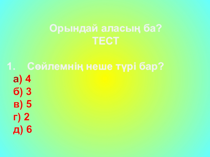 Орындай аласың ба?ТЕСТСөйлемнің неше түрі бар? а) 4  б) 3   в) 5