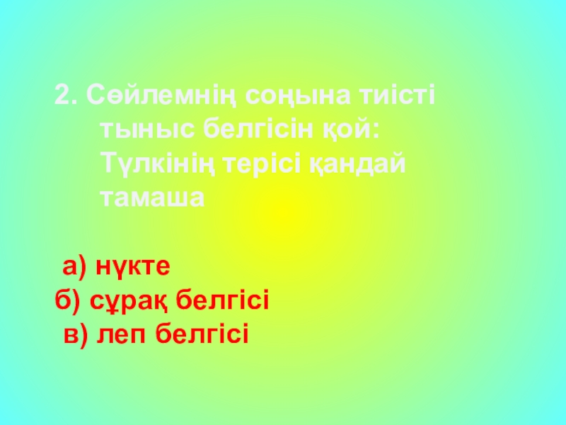 2. Сөйлемнің соңына тиісті тыныс белгісін қой: Түлкінің терісі қандай тамаша а) нүкте   б) сұрақ