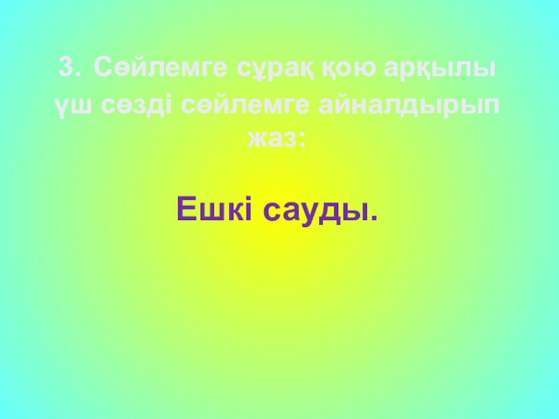 3. Сөйлемге сұрақ қою арқылы үш сөзді сөйлемге айналдырып жаз:Ешкі сауды.