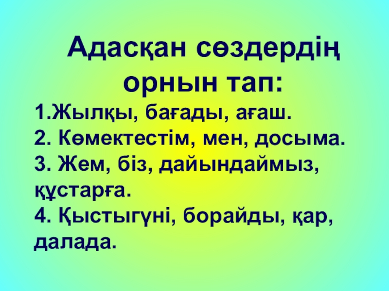 Адасқан сөздердің орнын тап:1.Жылқы, бағады, ағаш.2. Көмектестім, мен, досыма.3. Жем, біз, дайындаймыз, құстарға.4. Қыстыгүні, борайды, қар, далада.