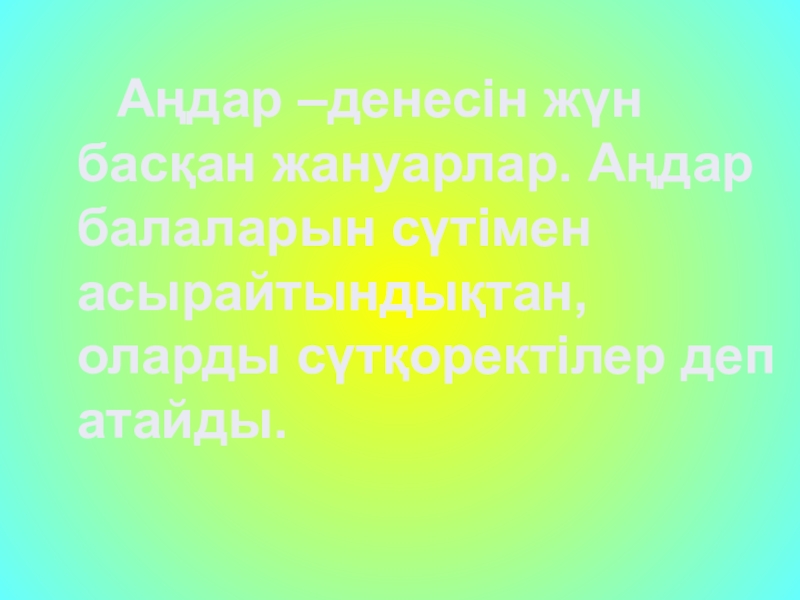 Слайд 25 Аңдар –денесін жүн басқан жануарлар. Аңдар балаларын сүтімен асырайтындықтан, оларды сүтқоректілер