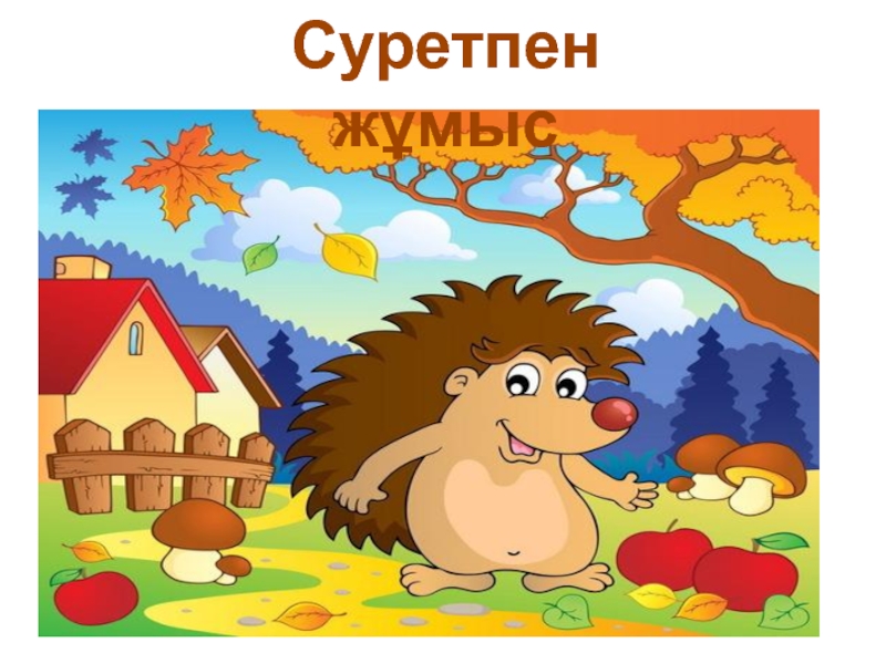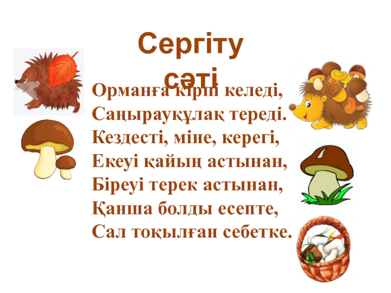Сергіту сәтіОрманға кірпі келеді, Саңырауқұлақ тереді. Кездесті, міне, керегі, Екеуі қайың астынан, Біреуі терек астынан, Қанша болды