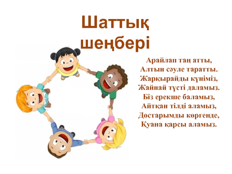 Шаттық шеңберіАрайлап таң атты, Алтын сәуле таратты. Жарқырайды күніміз, Жайнай түсті даламыз. Біз ерекше баламыз, Айтқан тілді аламыз, Достарымды көргенде, Қуана қарсы аламыз.