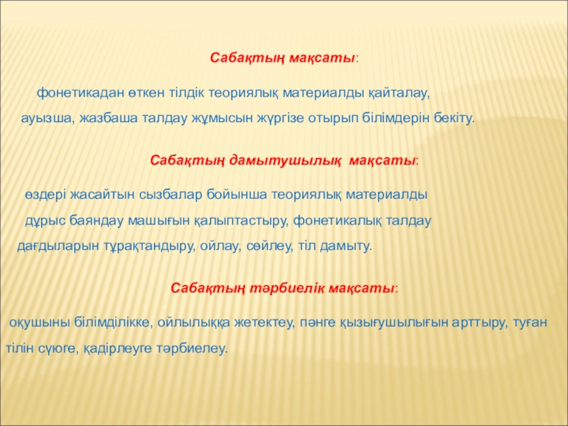 оқушыны білімділікке, ойлылыққа жетектеу, пәнге қызығушылығын арттыру, туған тілін сүюге, қадірлеуге тәрбиелеу.