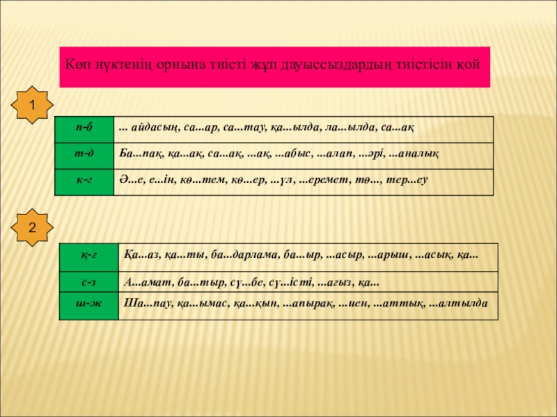 Слайд 13Көп нүктенің орнына тиісті жұп дауыссыздардың тиістісін қой