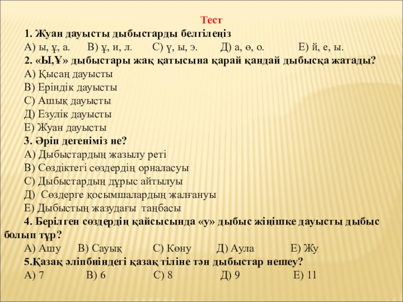 4. Берілген сөздердің қайсысында «у» дыбыс жіңішке дауысты дыбыс болып тұр?