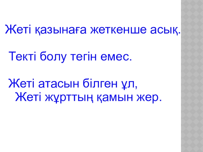 Жеті қазынаға жеткенше асық.	 Текті болу тегін емес.	 Жеті атасын білген ұл,	Жеті жұрттың қамын жер.