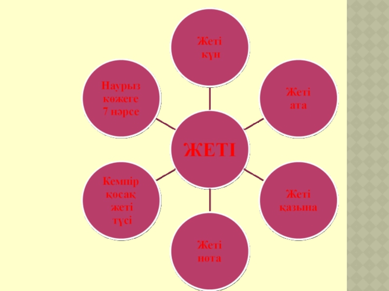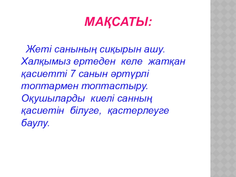 МАҚСАТЫ:	Жеті санының сиқырын ашу. Халқымыз ертеден келе жатқан қасиетті 7 санын әртүрлі топтармен топтастыру. Оқушыларды киелі санның