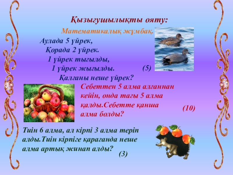 Тиін 6 алма, ал кірпі 3 алма теріп алды.Тиін кірпіге қарағанда неше алма артық жинап алды?