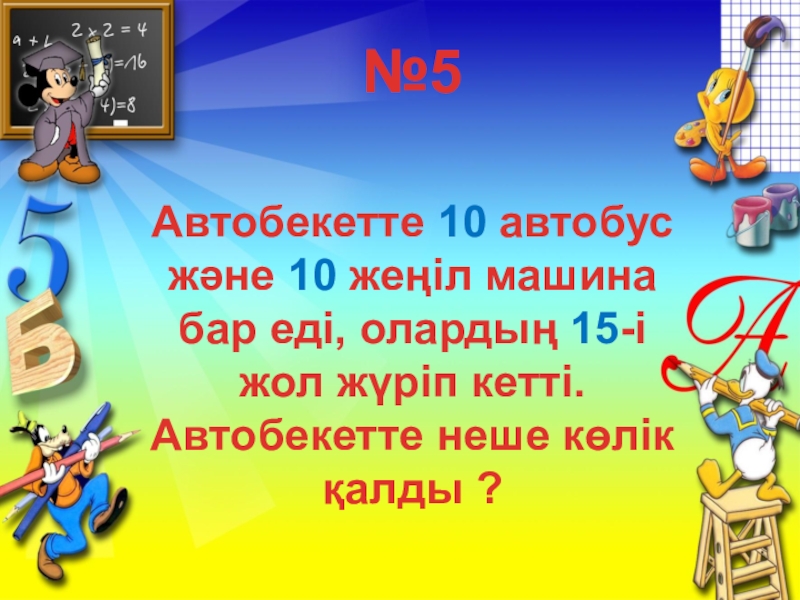 Себеттен 5 алма алғаннан кейін, онда тағы 5 алма қалды.Себетте қанша алма болды?