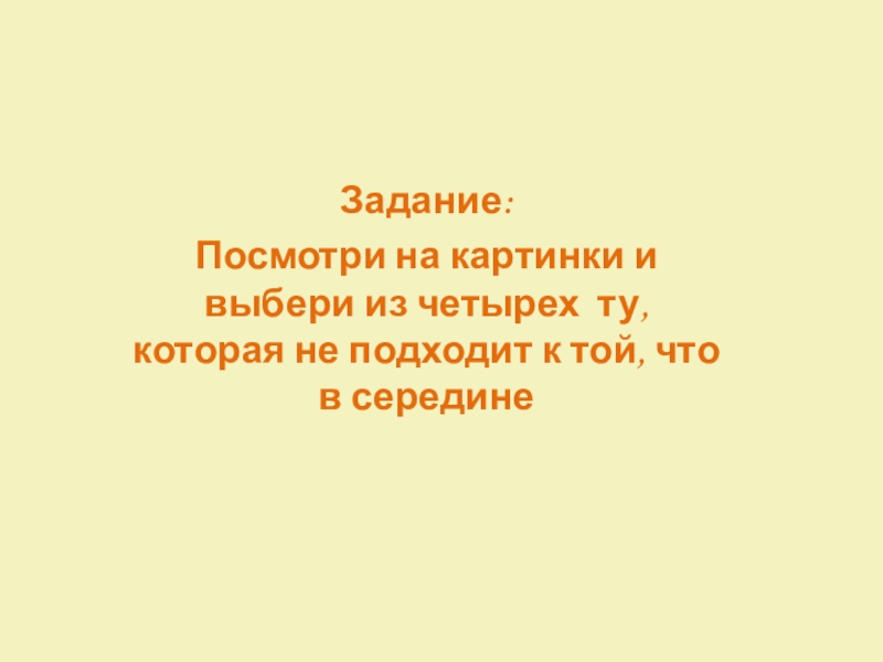 Задание:Посмотри на картинки и выбери из четырех ту, которая не подходит к той, что в середине