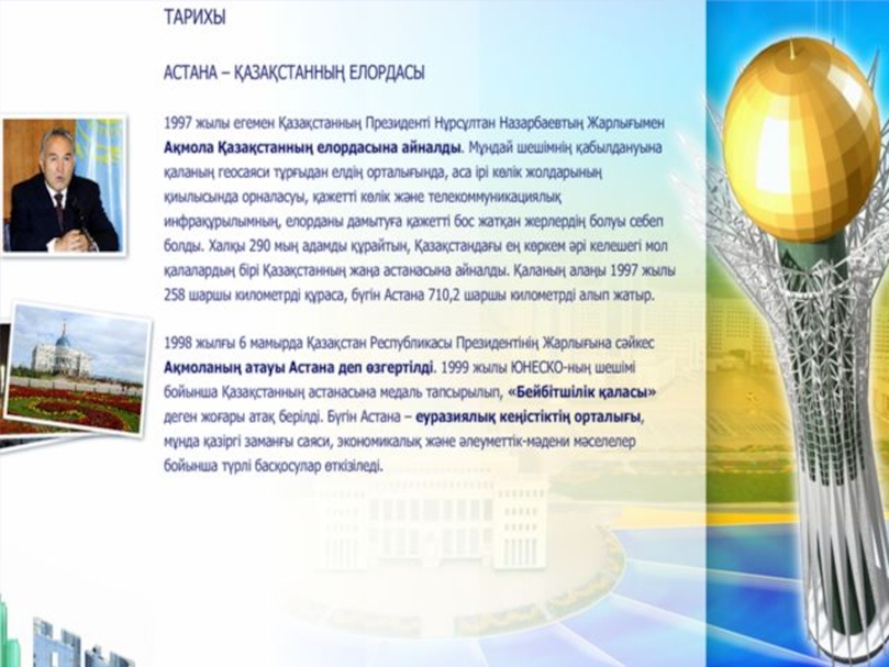 Астана – ел мақтанышы	Қазақстанның тарихи даму барысында бірнеше қала астана қызметін атқарған. 1920-1924 жылдары Орынбор қаласы, 1924-1928