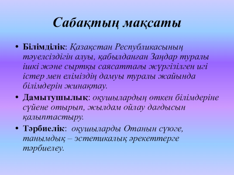 Сабақтың мақсаты Білімділік: Қазақстан Республикасының тәуелсіздігін алуы, қабылданған Заңдар туралы ішкі және сыртқы саясаттағы жүргізілген игі істер