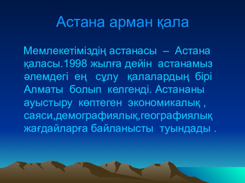 дейін астанамыз әлемдегі ең сұлу қалалардың бірі Алматы болып келгенді. Астананы ауыстыру көптеген экономикалық , саяси,демографиялық,географиялық жағдайларға байланысты туындады .