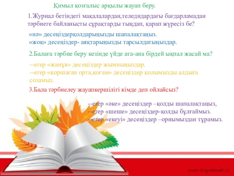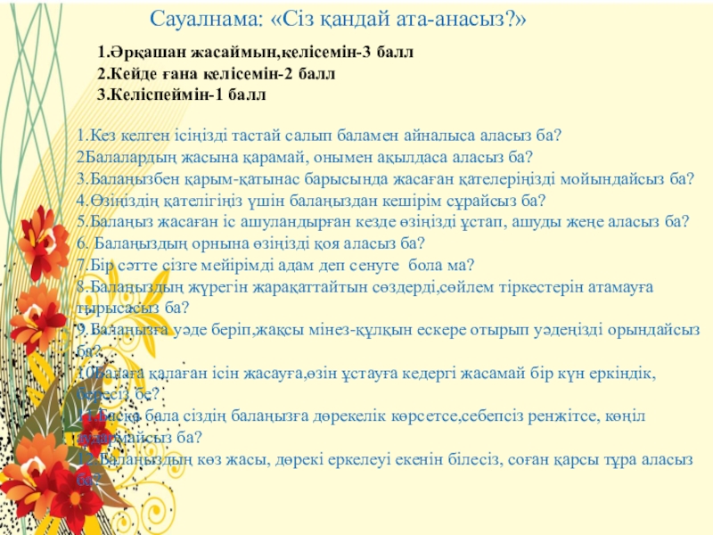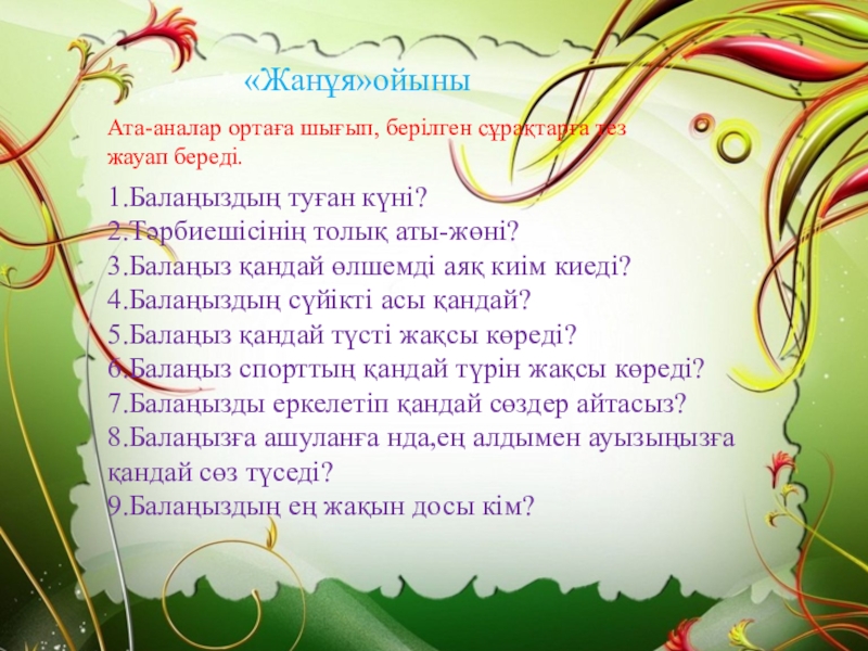 Ата-аналар ортаға шығып, берілген сұрақтарға тез жауап береді.
