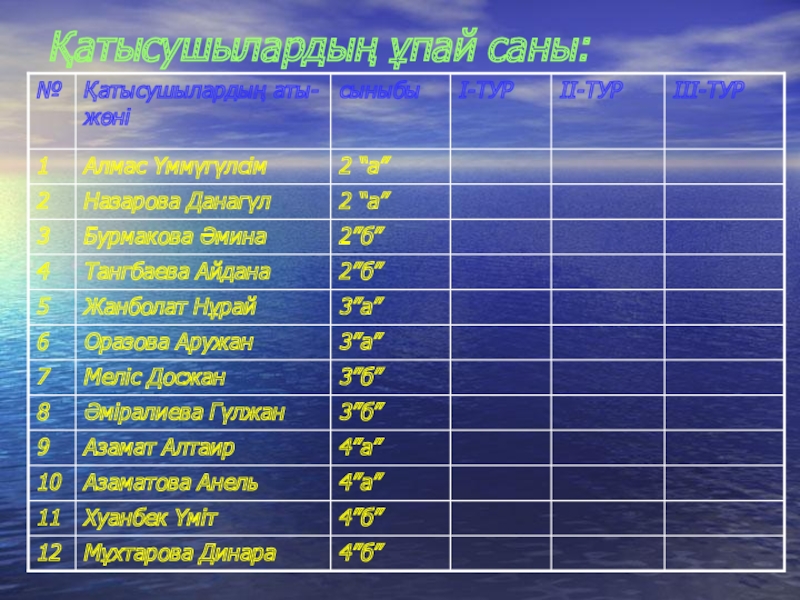 Слайд 2Қатысушылардың ұпай саны:
