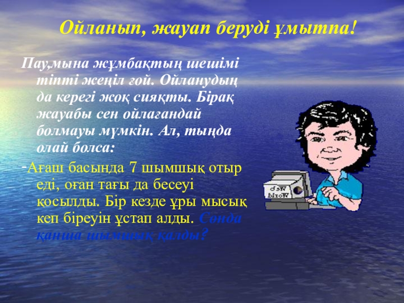 Ойланып, жауап беруді ұмытпа!Пау,мына жұмбақтың шешімі тіпті жеңіл ғой. Ойланудың да керегі жоқ сияқты. Бірақ жауабы сен