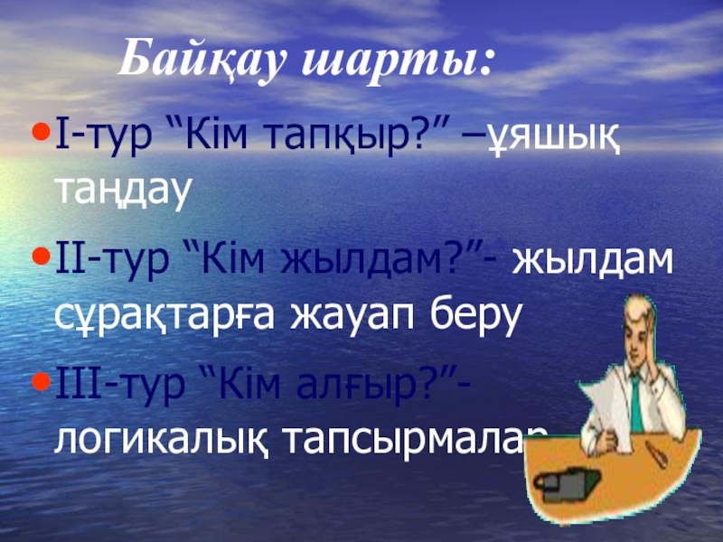 Байқау шарты:І-тур “Кім тапқыр?” –ұяшық таңдауІІ-тур “Кім жылдам?”- жылдам сұрақтарға жауап беруІІІ-тур “Кім алғыр?”-