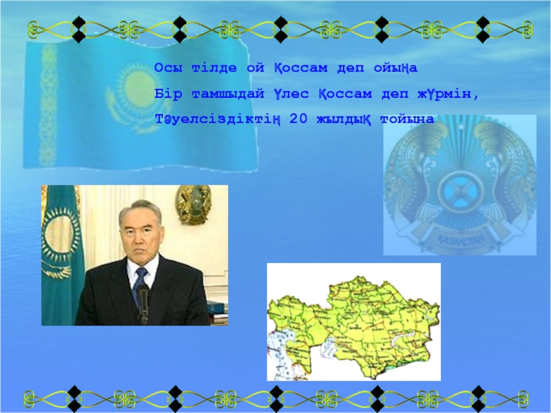 Осы тілде ой қоссам деп ойыңаБір тамшыдай үлес қоссам деп жүрмін,Тәуелсіздіктің 20 жылдық тойына