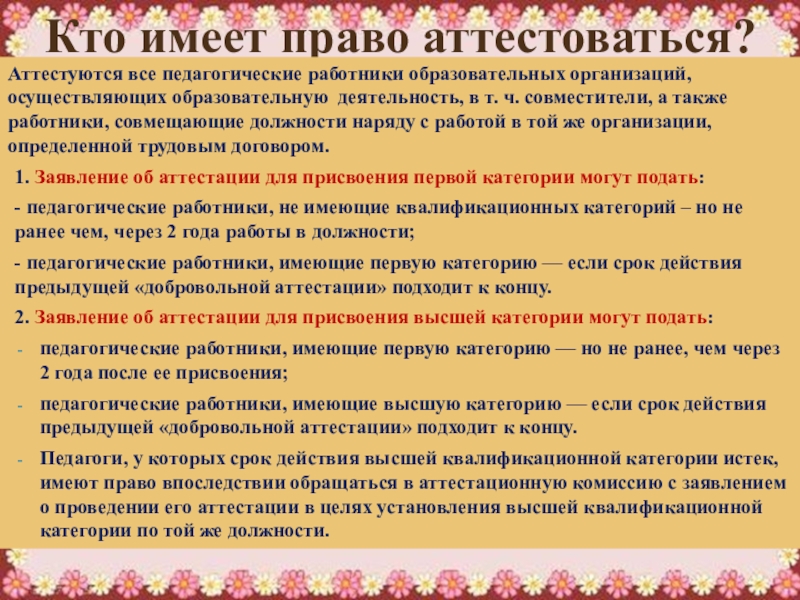 - педагогические работники, имеющие первую категорию — если срок действия предыдущей «добровольной аттестации» подходит к концу.