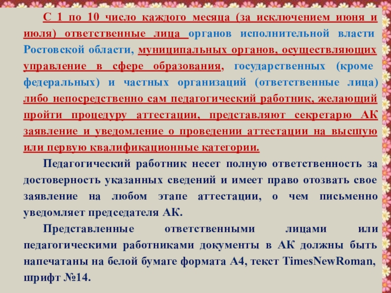 июля) ответственные лица органов исполнительной власти Ростовской области, муниципальных органов, осуществляющих управление в сфере образования, государственных (кроме федеральных) и частных организаций (ответственные лица) либо непосредственно сам педагогический работник, желающий пройти процедуру аттестации, представляют секретарю АК заявление и уведомление о проведении аттестации на высшую или первую квалификационные категории.