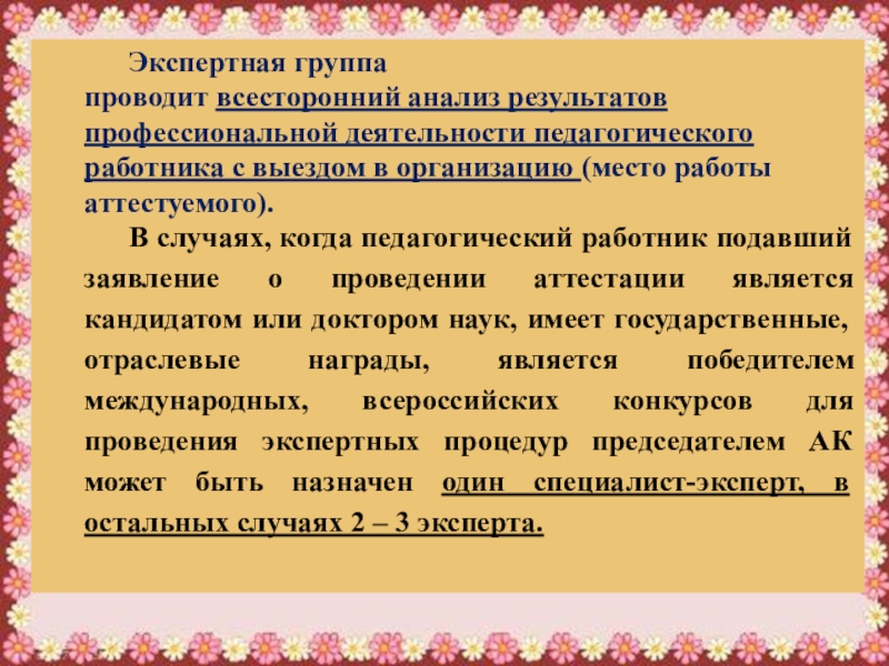 В случаях, когда педагогический работник подавший заявление о проведении аттестации является кандидатом или доктором наук, имеет государственные, отраслевые награды, является победителем международных, всероссийских конкурсов для проведения экспертных процедур председателем АК может быть назначен один специалист-эксперт, в остальных случаях 2 – 3 эксперта.