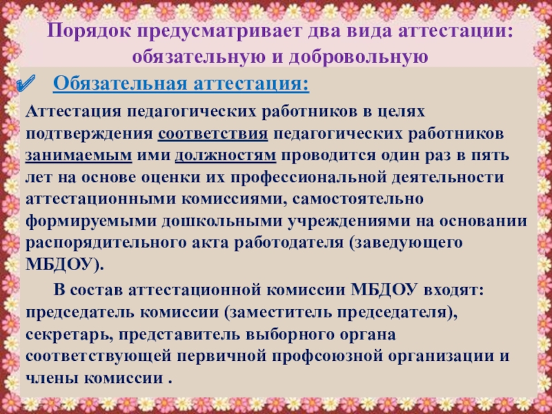 Слайд 8Порядок предусматривает два вида аттестации: обязательную и добровольную
