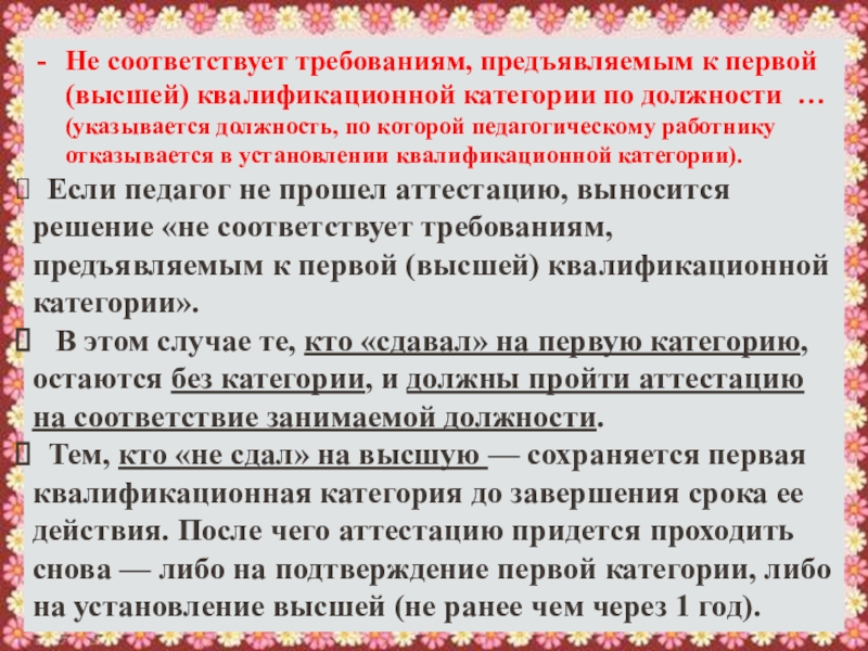 Если педагог не прошел аттестацию, выносится решение «не соответствует требованиям, предъявляемым к первой (высшей) квалификационной категории».