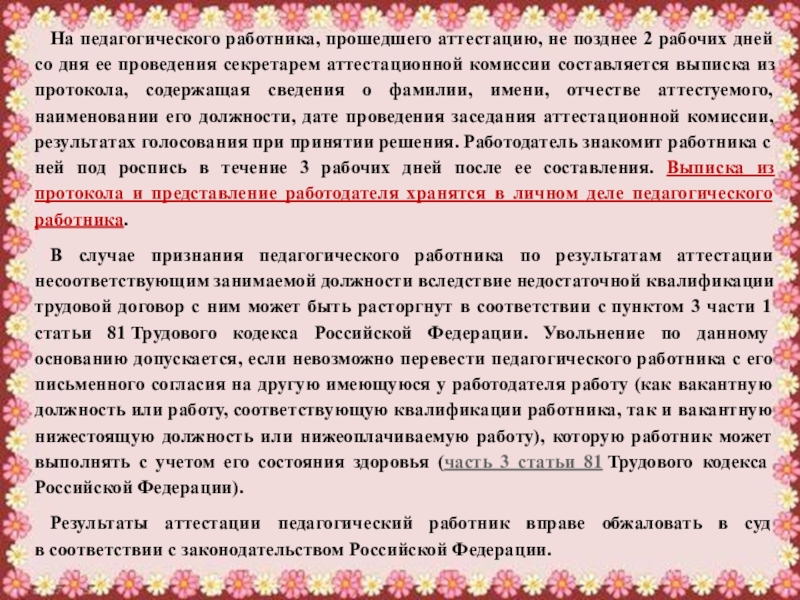 Слайд 11На педагогического работника, прошедшего аттестацию, не позднее 2 рабочих дней со