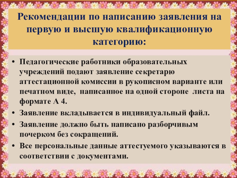 Слайд 17Рекомендации по написанию заявления на первую и высшую квалификационную категорию: