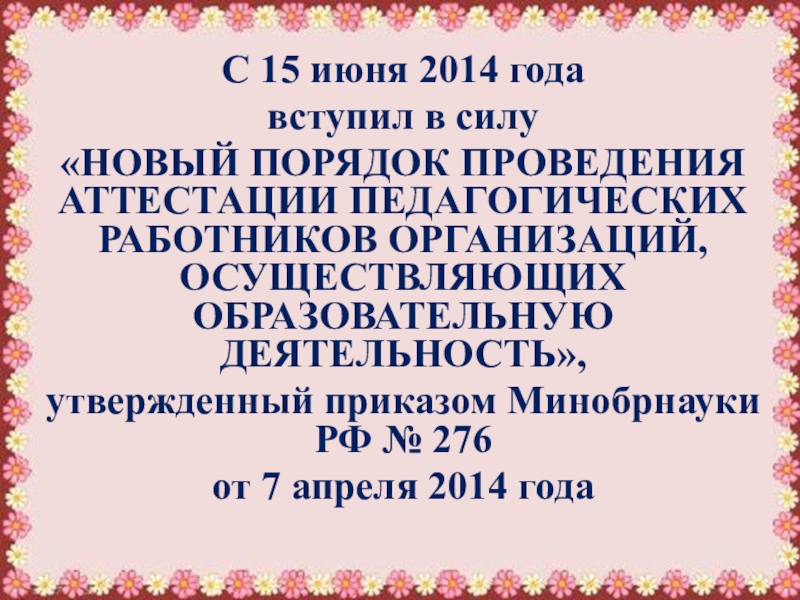 Приказом Минобрнауки РФ № 276 от 07.04.2014г. «О порядке проведения аттестации педагогических работников организаций, осуществляющих образовательную деятельность»