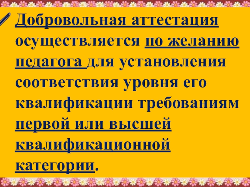 Слайд 13Добровольная аттестация осуществляется по желанию педагога для установления соответствия уровня его
