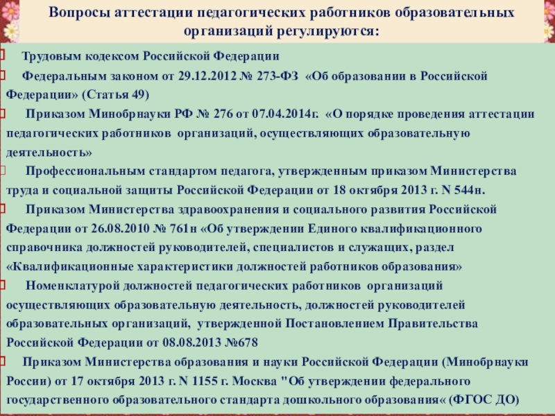Слайд 3Вопросы аттестации педагогических работников образовательных организаций регулируются: