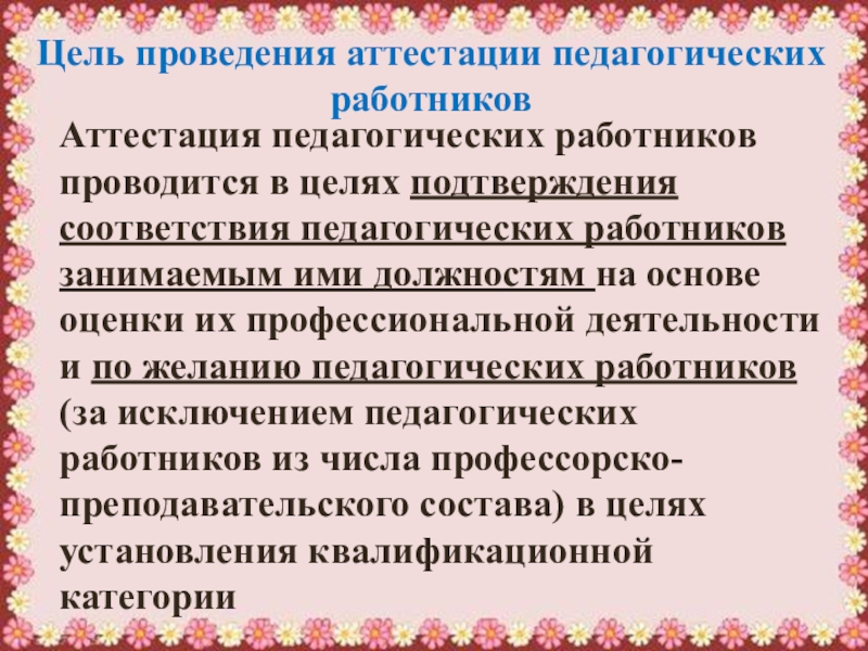 соответствия педагогических работников занимаемым ими должностям на основе оценки их профессиональной деятельности и по желанию педагогических работников (за исключением педагогических работников из числа профессорско-преподавательского состава) в целях установления квалификационной категории