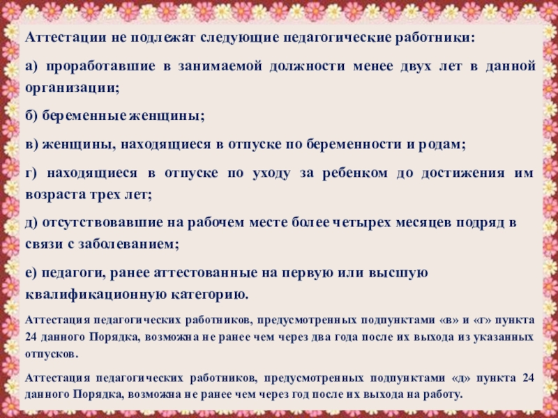 Аттестация педагогических работников, предусмотренных подпунктами «в» и «г» пункта 24 данного Порядка, возможна не ранее чем через два года после их выхода из указанных отпусков.