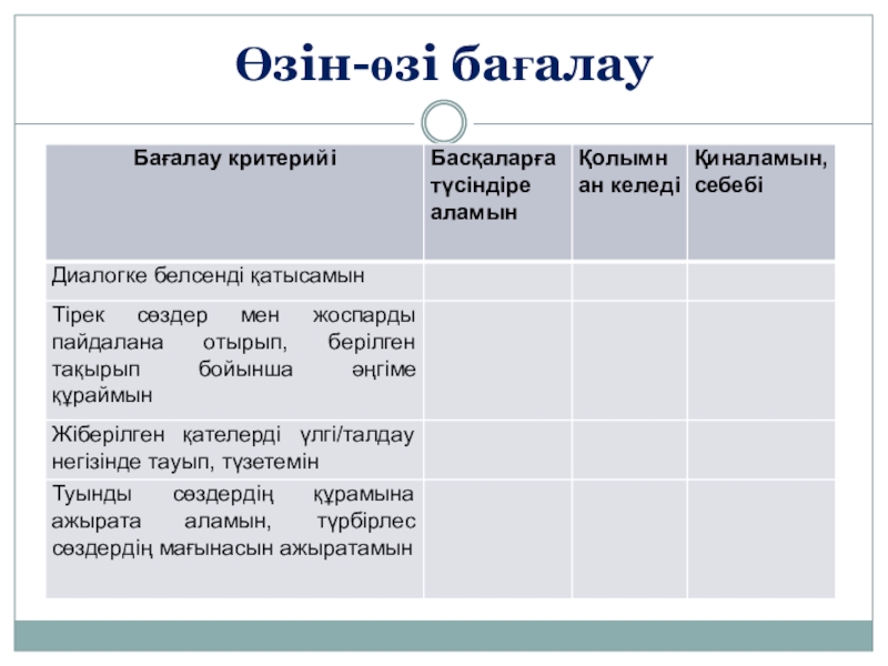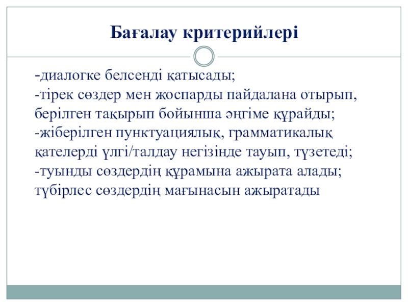 Бағалау критерийлері-диалогке белсенді қатысады;-тірек сөздер мен жоспарды пайдалана отырып, берілген тақырып бойынша әңгіме құрайды;-жіберілген пунктуациялық, грамматикалық қателерді