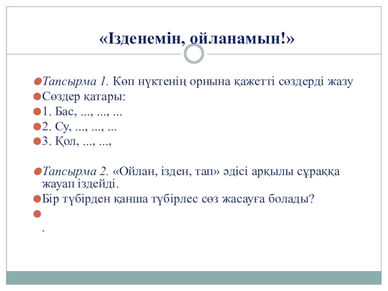 «Ізденемін, ойланамын!» Тапсырма 1. Көп нүктенің орнына қажетті сөздерді жазуСөздер қатары:1. Бас, ..., ..., ... 2.