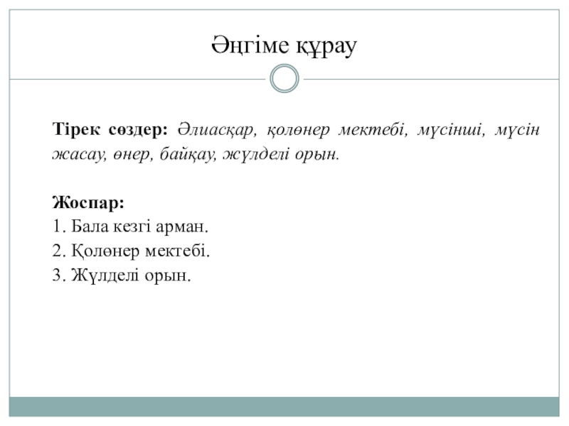 Әңгіме құрауТірек сөздер: Әлиасқар, қолөнер мектебі, мүсінші, мүсін жасау, өнер, байқау, жүлделі орын.Жоспар:1. Бала кезгі арман.2. Қолөнер