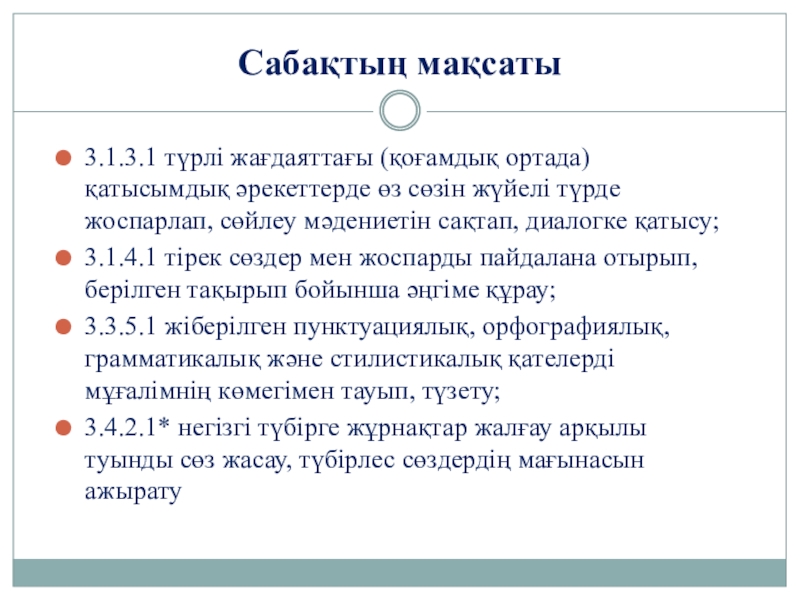 Сабақтың мақсаты3.1.3.1 түрлі жағдаяттағы (қоғамдық ортада) қатысымдық әрекеттерде өз сөзін жүйелі түрде жоспарлап, сөйлеу мәдениетін сақтап, диалогке қатысу;3.1.4.1 тірек сөздер мен жоспарды пайдалана отырып, берілген тақырып бойынша әңгіме құрау;3.3.5.1 жіберілген пунктуациялық, орфографиялық, грамматикалық және стилистикалық қателерді
