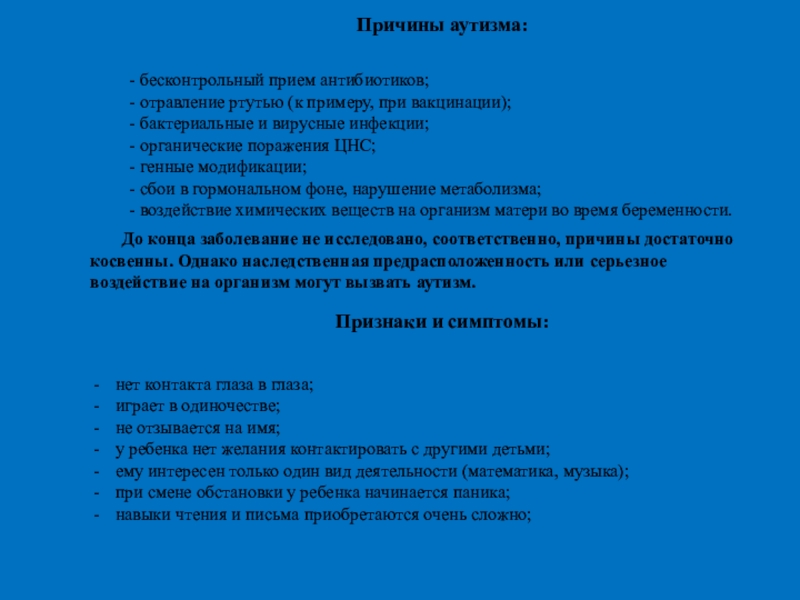 До конца заболевание не исследовано, соответственно, причины достаточно косвенны. Однако наследственная предрасположенность или серьезное воздействие на организм могут вызвать аутизм.