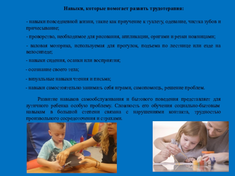 Развитие навыков самообслуживания и бытового поведения представляет для аутичного ребенка особую проблему. Сложность его обучения социально-бытовым навыкам в большой степени связана с нарушениями контакта, трудностью произвольного сосредоточения и страхами.
