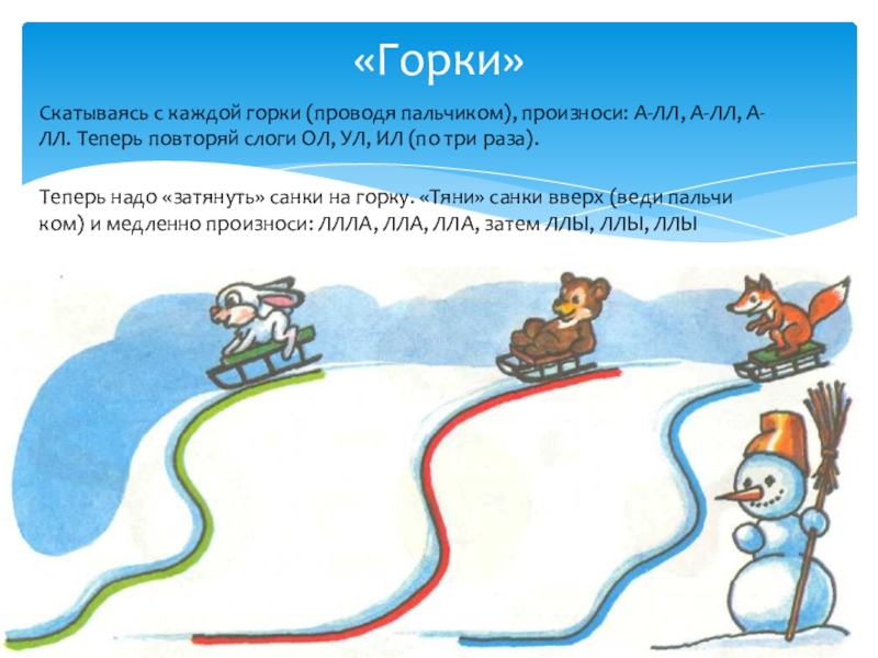 Теперь надо «затянуть» санки на горку. «Тяни» санки вверх (веди пальчиком) и медленно произноси: ЛЛЛА, ЛЛА, ЛЛА, затем ЛЛЫ, ЛЛЫ, ЛЛЫ