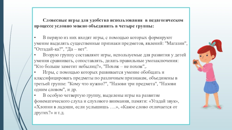 Слайд 9 Словесные игры для удобства использования в педагогическом процессе условно можно объединить