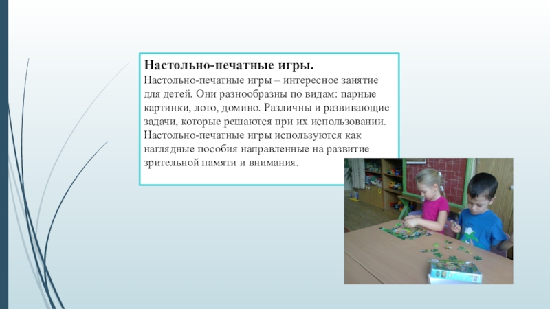 Настольно-печатные игры используются как наглядные пособия направленные на развитие зрительной памяти и внимания.