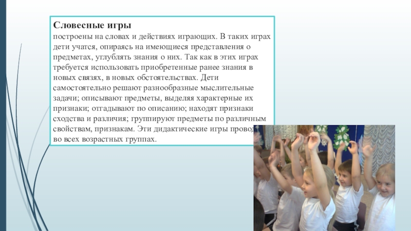 учатся, опираясь на имеющиеся представления о предметах, углублять знания о них. Так как в этих играх требуется использовать приобретенные ранее знания в новых связях, в новых обстоятельствах. Дети самостоятельно решают разнообразные мыслительные задачи; описывают предметы, выделяя характерные их признаки; отгадывают по описанию; находят признаки сходства и различия; группируют предметы по различным свойствам, признакам. Эти дидактические игры проводятся во всех возрастных группах.