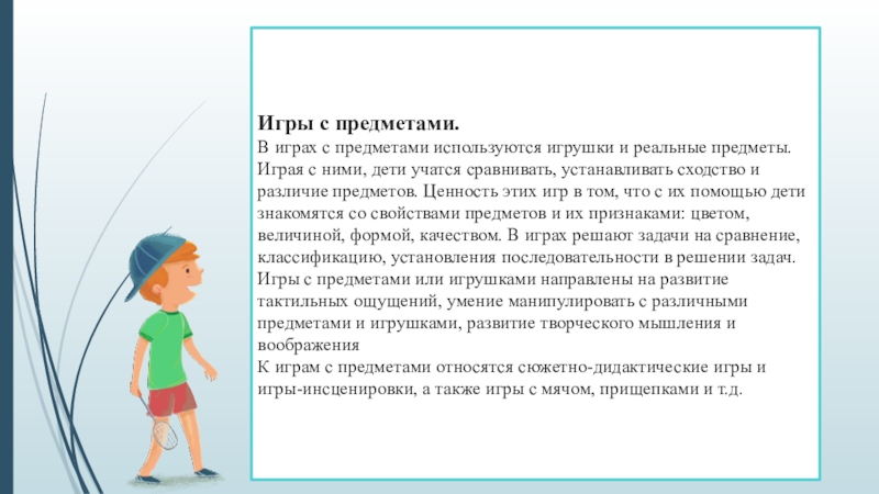предметы. Играя с ними, дети учатся сравнивать, устанавливать сходство и различие предметов. Ценность этих игр в том, что с их помощью дети знакомятся со свойствами предметов и их признаками: цветом, величиной, формой, качеством. В играх решают задачи на сравнение, классификацию, установления последовательности в решении задач. Игры с предметами или игрушками направлены на развитие тактильных ощущений, умение манипулировать с различными предметами и игрушками, развитие творческого мышления и воображения