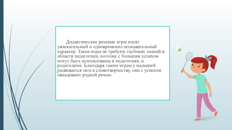 Слайд 4 Дидактические речевые игры носят увлекательный и одновременно познавательный характер. Такие игры