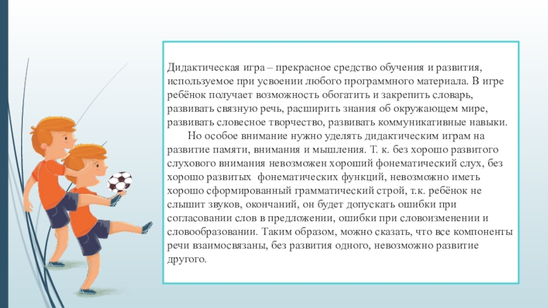Но особое внимание нужно уделять дидактическим играм на развитие памяти, внимания и мышления. Т. к. без хорошо развитого слухового внимания невозможен хороший фонематический слух, без хорошо развитых фонематических функций, невозможно иметь хорошо сформированный грамматический строй, т.к. ребёнок не слышит звуков, окончаний, он будет допускать ошибки при согласовании слов в предложении, ошибки при словоизменении и словообразовании. Таким образом, можно сказать, что все компоненты речи взаимосвязаны, без развития одного, невозможно развитие другого.